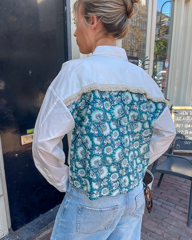 De Rania Poplin blouse is met zorg handgemaakt in India, waarbij uitsluitend zorgvuldig geselecteerde deadstock stoffen worden hergebruikt, wat elk stuk uniek maakt. De klassieke witte voorkant straalt frisheid uit, terwijl de achterkant met speelse print een verrassend en eigentijds detail toevoegt. Dankzij de boxy, cropped fit heeft de blouse een moderne, hippe uitstraling. De luchtige poplin stof combineert stijl met comfort, waardoor deze blouse perfect is voor elke gelegenheid!