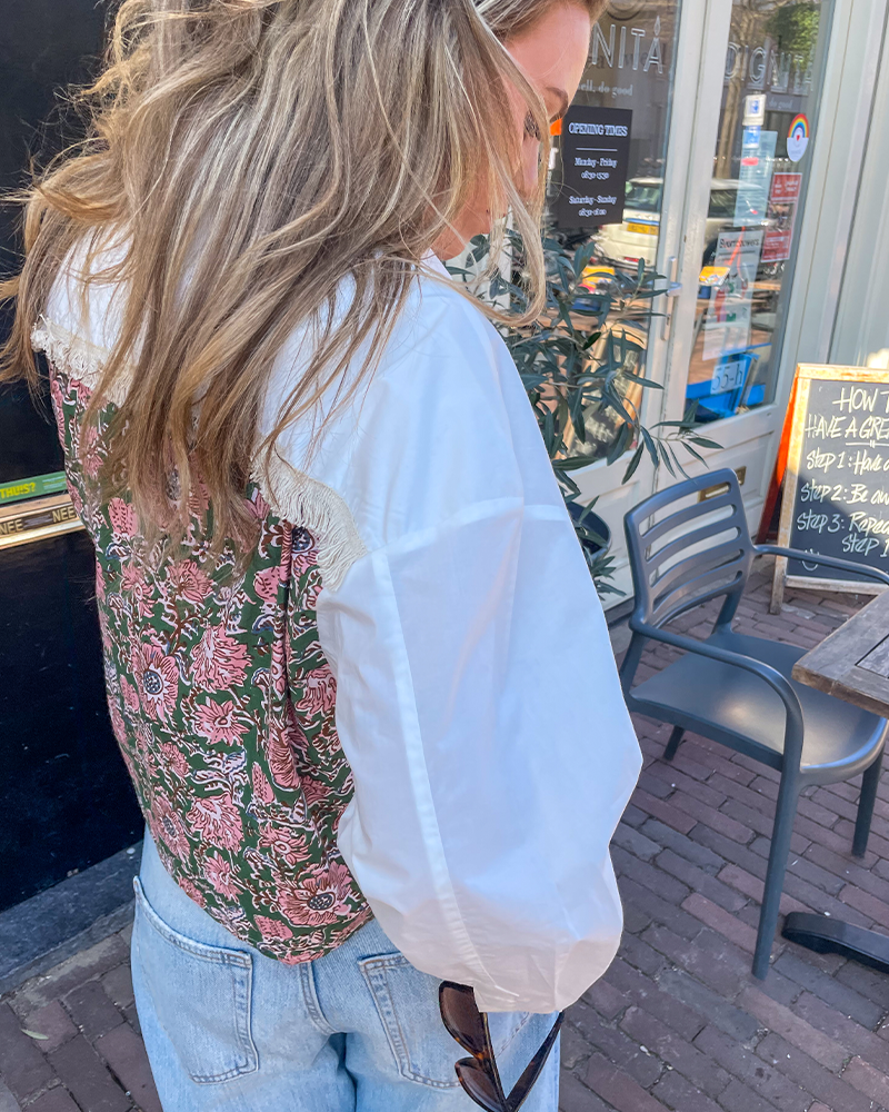 De Rania Poplin blouse is met zorg handgemaakt in India, waarbij uitsluitend zorgvuldig geselecteerde deadstock stoffen worden hergebruikt, wat elk stuk uniek maakt. De klassieke witte voorkant straalt frisheid uit, terwijl de achterkant met speelse print een verrassend en eigentijds detail toevoegt. Dankzij de boxy, cropped fit heeft de blouse een moderne, hippe uitstraling. De luchtige poplin stof combineert stijl met comfort, waardoor deze blouse perfect is voor elke gelegenheid!