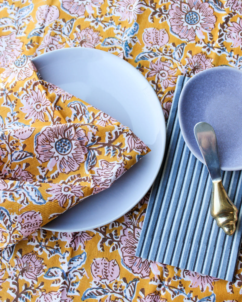 Set van 4 katoenen servetten in mosterdgeel-roze bloemendesign, handbedrukt met traditionele blockprint. Elk patroon wordt met zorg aangebracht met een handgesneden houten blok, wat zorgt voor een uniek en ambachtelijk karakter. Tijdloos, duurzaam en met oog voor detail, een prachtige toevoeging aan elke eetervaring. Perfect voor jezelf of als cadeau.