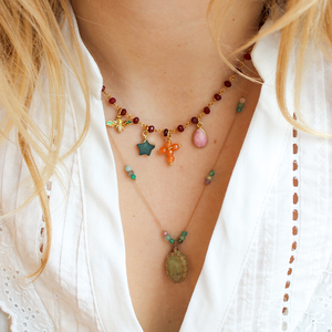 Een handgemaakte ketting van jade met speelse bedels die samen een uniek geheel vormen. Met zorg met de hand samengesteld. Door de variatie in kleur, vorm en bedels is iedere ketting anders. Van elke ketting is er slechts één exemplaar.