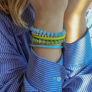 Classic with a playful twist. This bracelet is hand knotted with lustrous pearls on blue thread and finished with an 18k gold plated brass clasp. Thanks to its adjustable design, it’s always comfortable to wear. A fresh take on the traditional pearl bracelet, perfect for layering with other bracelets.