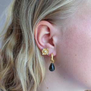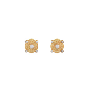 Add a touch of sophistication to any look with these beautiful gold studs. The design combines a warm, shimmering gold with subtle pearls that softly catch the light and exude natural elegance. The sun-like engraving in the center gives the earrings a playful yet classic look. Perfect for both everyday wear and special occasions.
