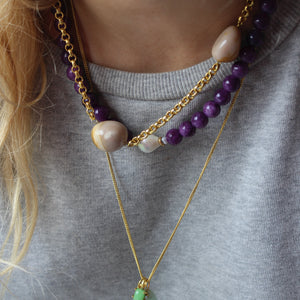 This gold chain necklace with agate stones exudes timeless elegance. It effortlessly adds a classic touch to any outfit. Perfect for wearing solo or layering with other necklaces for a unique, layered look!