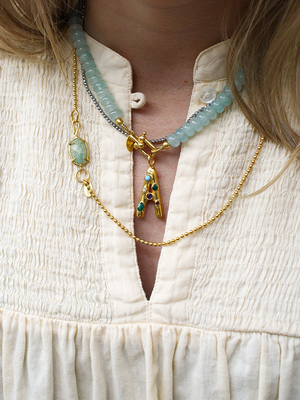 Give a personal gift with our Initial Charm A! This beautiful charm, set with gemstones such as Turquoise, Amethyst, Green Jade, Aventurine and Pearl, is perfect for wearing a special letter, whether it is yours, your mother, child or someone else dear to you. Combine the charm with our elegant gold chains to create a complete and stylish gift for any occasion!
