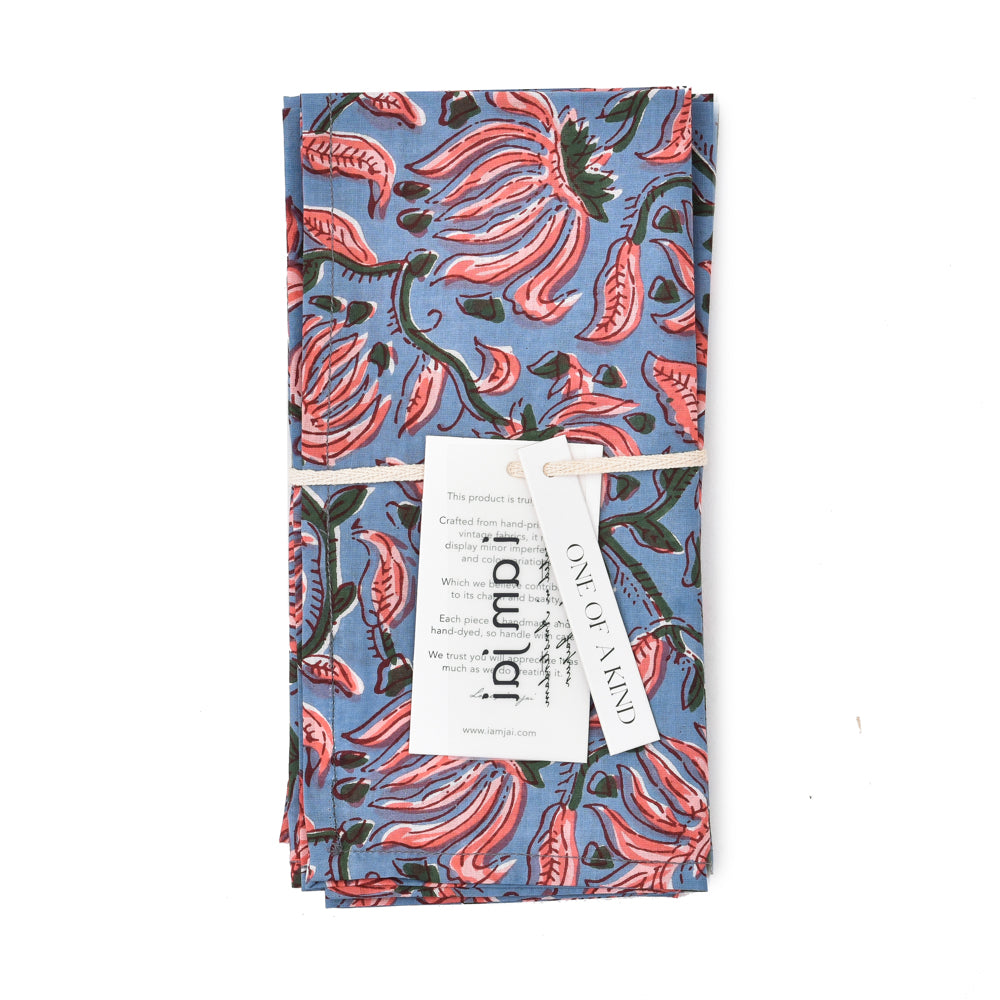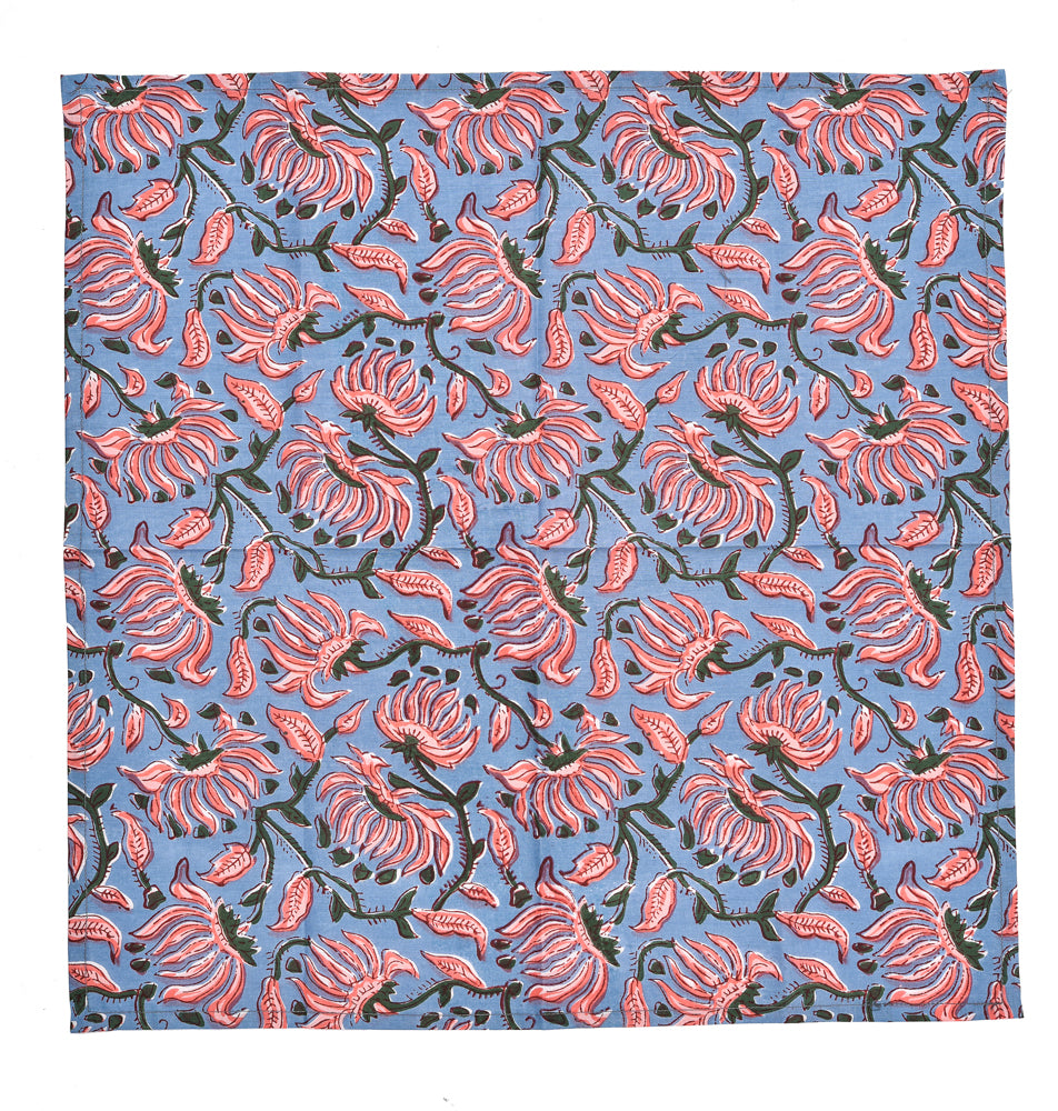 Set of 4 cotton napkins in a light blue-pink floral design, hand-printed with traditional block print. Each pattern is carefully applied with a hand-carved wooden block, ensuring a unique and artisanal character. Timeless, durable, and with an eye for detail, a beautiful addition to any dining experience. Perfect for yourself or as a gift.