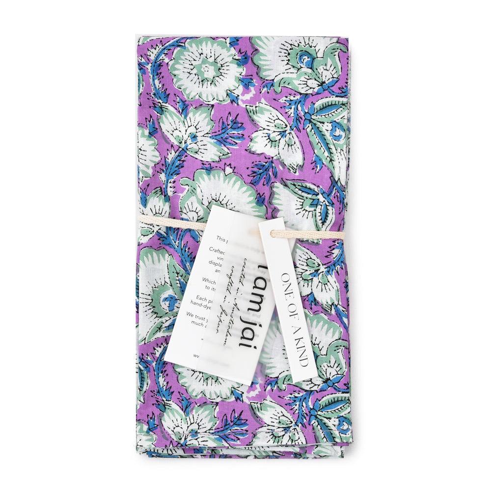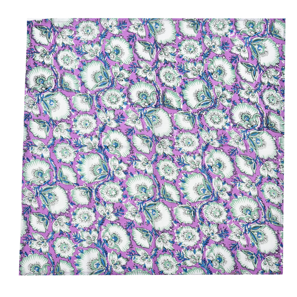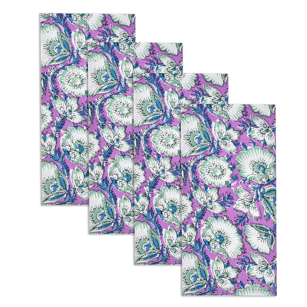 Set of 4 cotton napkins in purple and white floral design, hand-printed with traditional block print. Each pattern is carefully applied with a hand-carved wooden block, ensuring a unique and artisanal character. Timeless, durable and with an eye for detail, a beautiful addition to any dining experience. Perfect for yourself or as a gift.