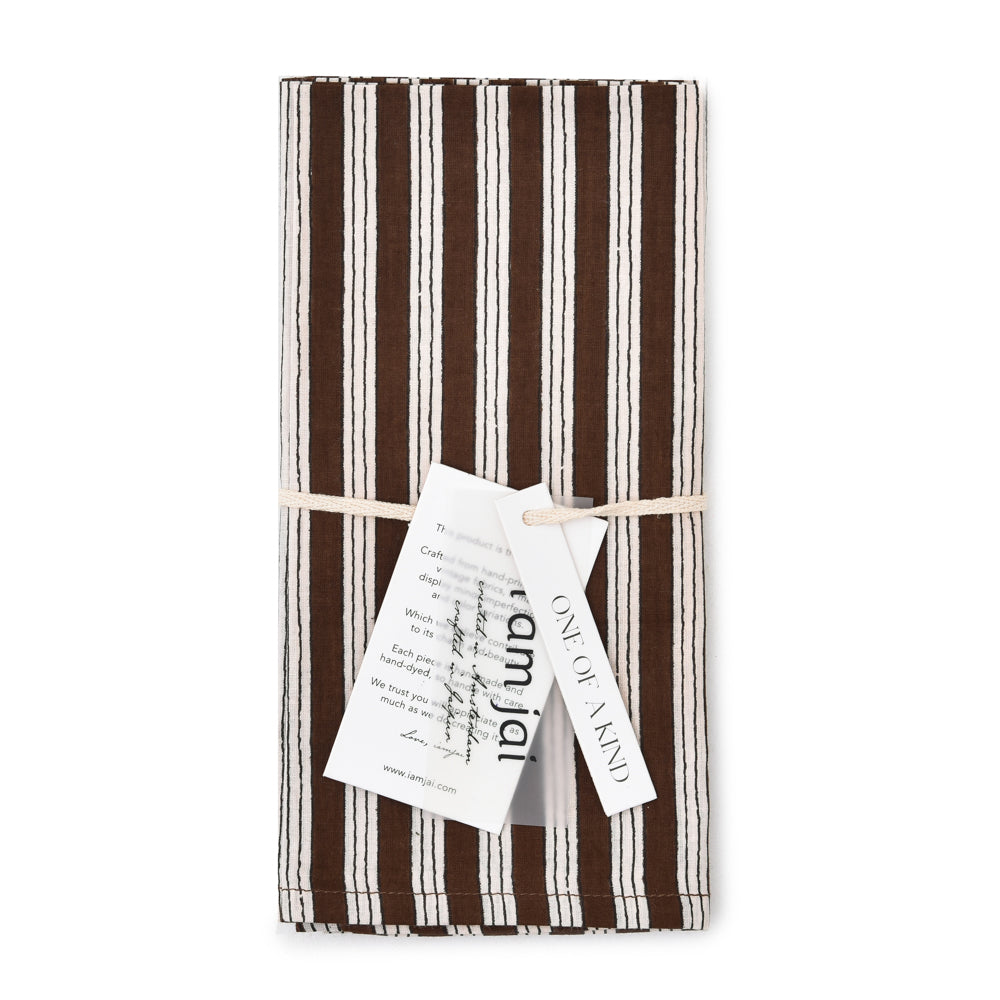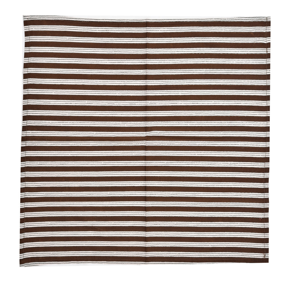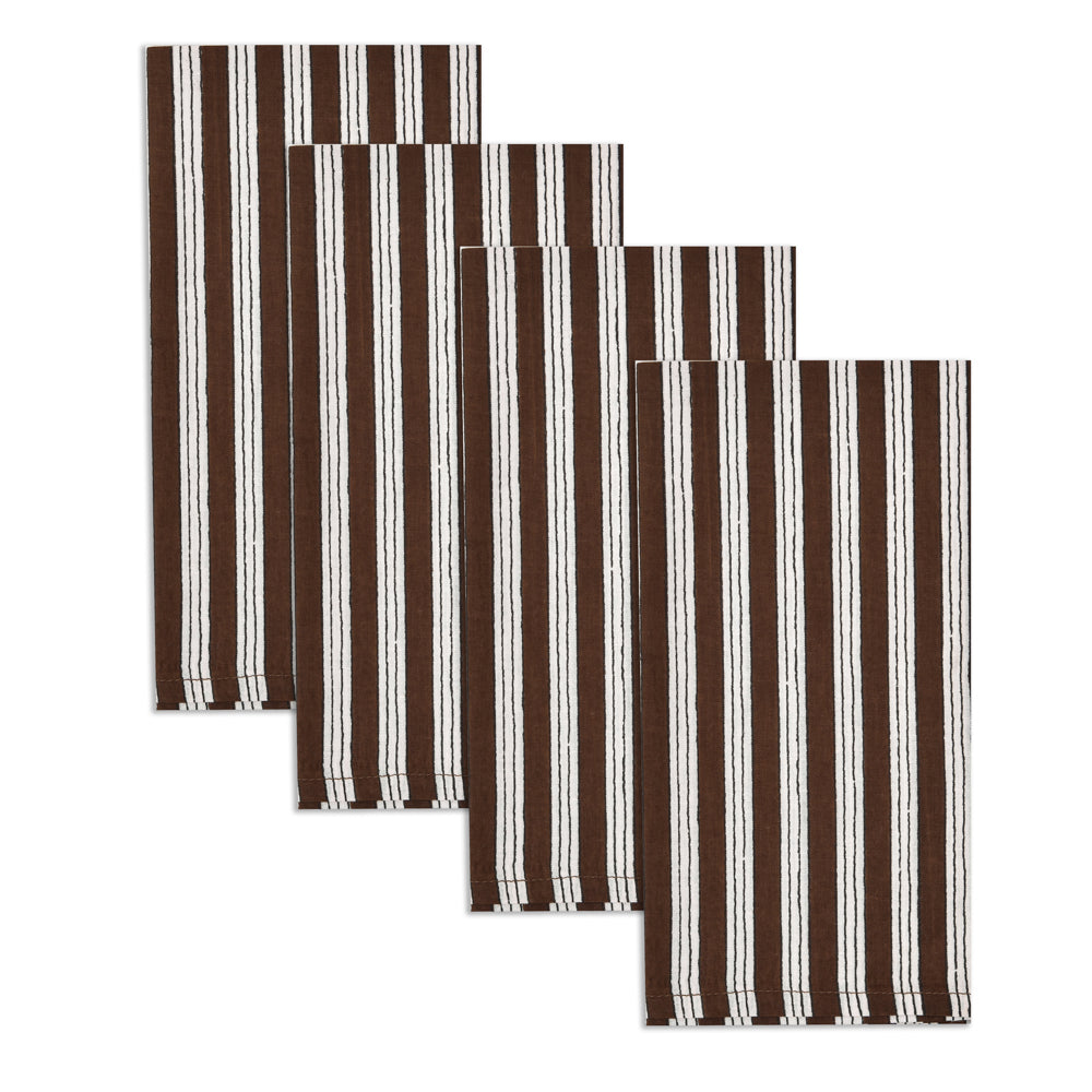 Set of 4 cotton napkins in dark brown and white stripe design, hand-printed with traditional block print. Each pattern is carefully applied with a hand-carved wooden block, ensuring a unique and artisanal character. Timeless, durable, and with an eye for detail, a beautiful addition to any dining experience. Perfect for yourself or as a gift.