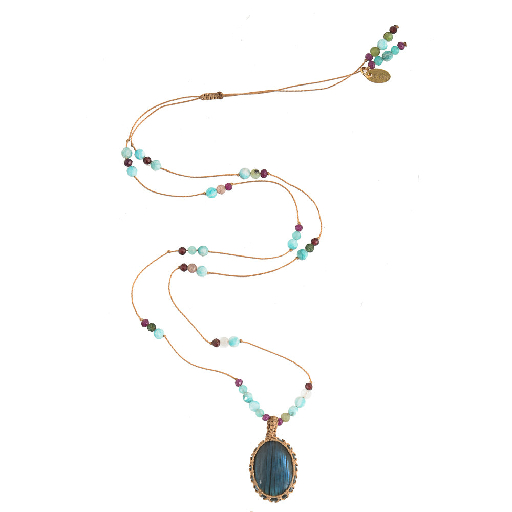 This hand-knotted cord necklace in beige is subtle and stylish. Tiny gemstones adorn the cord, while the large labradorite pendant adds a striking accent. Each necklace is unique and one of a kind, making it a truly personal piece. Wear it solo for a natural look or layer it with other necklaces for a layered effect.