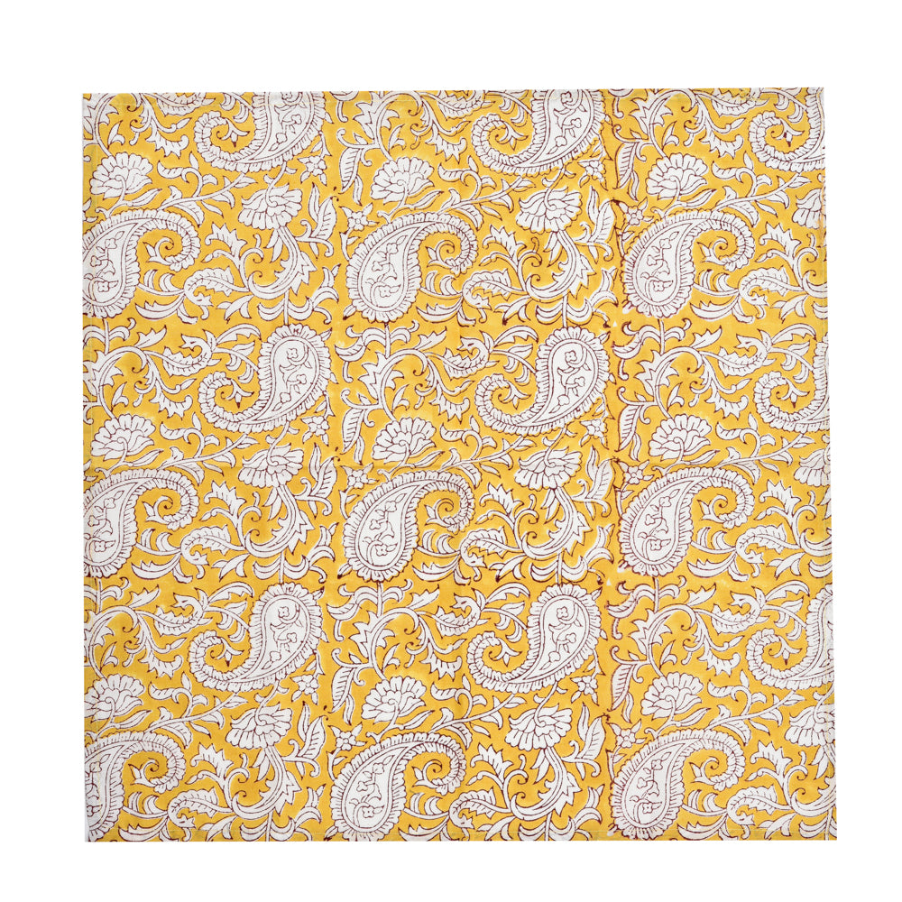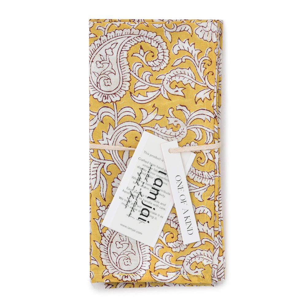 Set of 4 cotton napkins in a yellow and white floral design, hand-printed with traditional block print. Each pattern is carefully applied with a hand-carved wooden block, ensuring a unique and artisanal character. Timeless, durable, and with an eye for detail, a beautiful addition to any dining experience. Perfect for yourself or as a gift.
