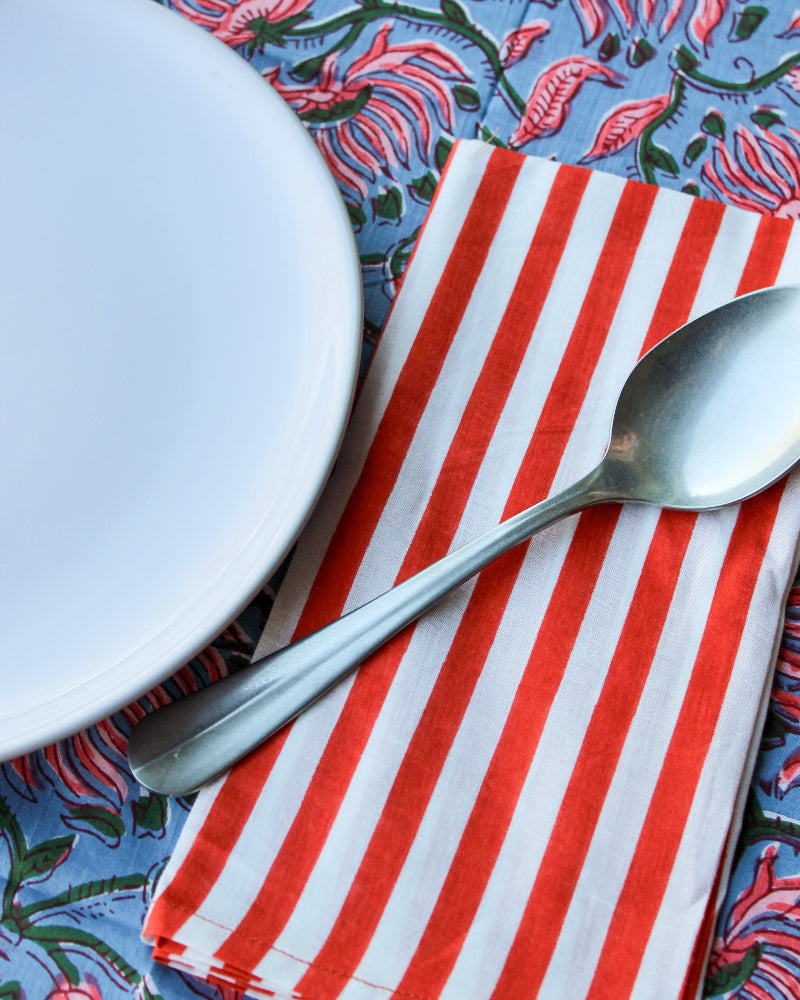 Set of 4 cotton napkins in an orange and white stripe design, hand-printed with traditional block print. Each pattern is carefully applied with a hand-carved wooden block, ensuring a unique and artisanal character. Timeless, durable, and with an eye for detail, a beautiful addition to any dining experience. Perfect for yourself or as a gift.