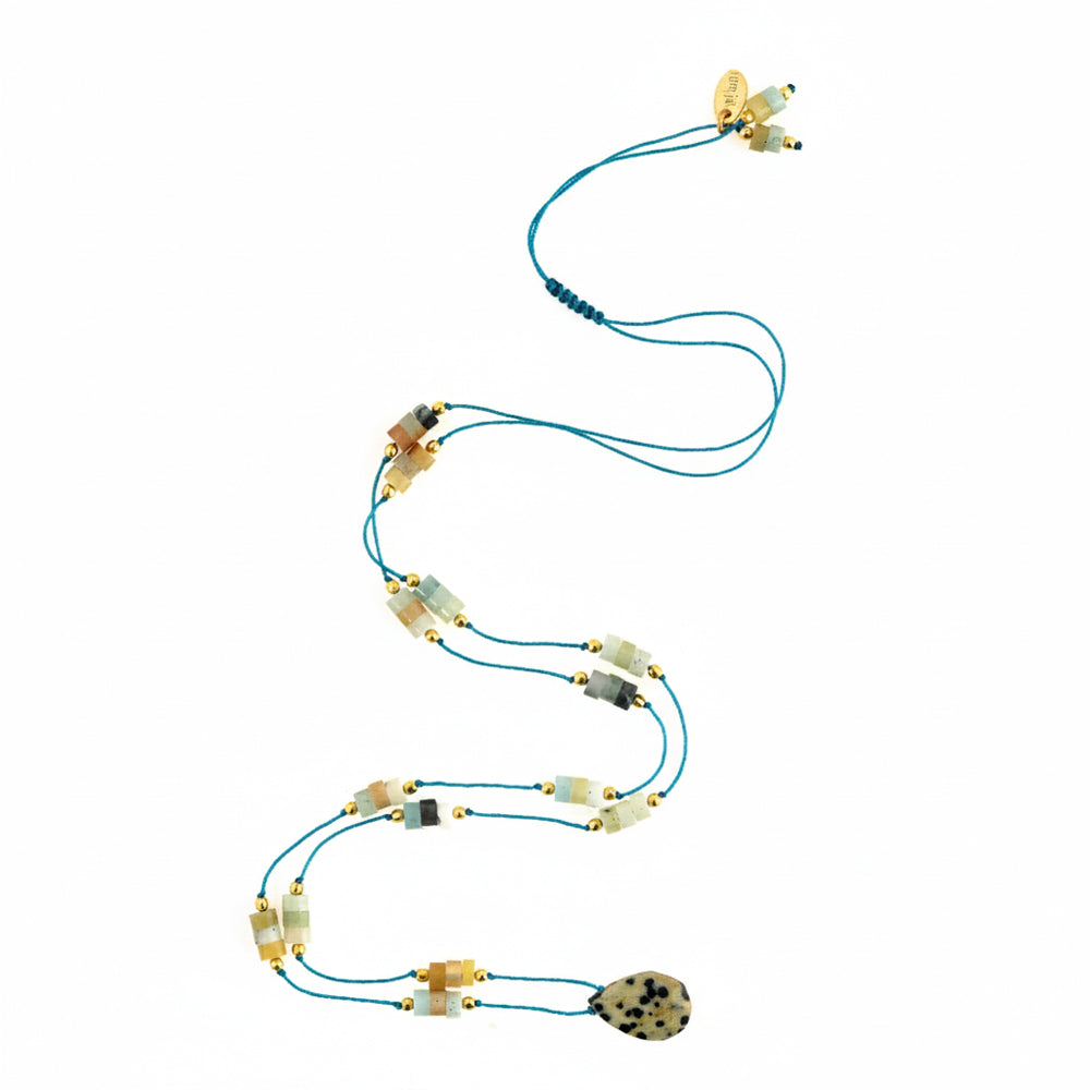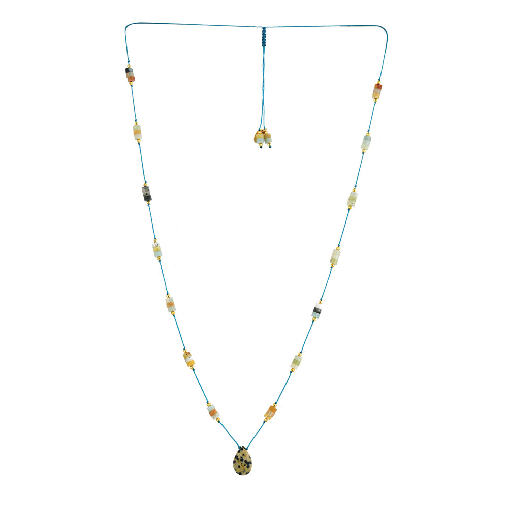 - Hand-knotted blue cord necklace with Dalmatian jasper pendant