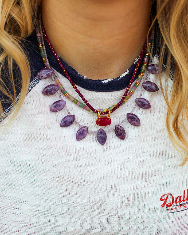 Discover the elegant charm of this purple agate necklace with teardrop beads. Each bead features unique purple hues, from soft lavender to deep amethyst, making every necklace one-of-a-kind. The teardrop-shaped beads subtly catch the light, giving a refined look. Wear it solo for a timeless style or layer it for a statement.