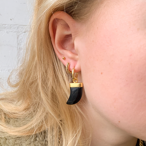 Onze zwarte onyx tand oorbellen combineren kracht en elegantie in één stijlvol ontwerp. De gouden oorringen met diepzwarte onyx tandbedel geven een edgy, luxe uitstraling.