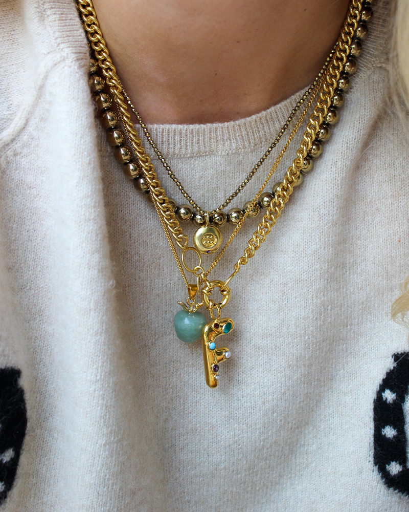 Geef een persoonlijk cadeau met onze Initial Bedel F! Deze prachtige bedel, bezet met edelstenen zoals Turquoise, Amethist, Groene Jade, Aventurijn en Parel, is perfect om een speciale letter te dragen – of het nu die van jezelf, je moeder, kind of iemand anders is die je dierbaar is. Combineer de bedel met onze elegante gouden kettingen om een compleet en stijlvol cadeau te creëren voor elke gelegenheid!