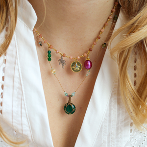 Een handgemaakte ketting van jade met speelse bedels die samen een uniek geheel vormen. Met zorg met de hand samengesteld. Door de variatie in kleur, vorm en bedels is iedere ketting anders. Van elke ketting is er slechts één exemplaar.