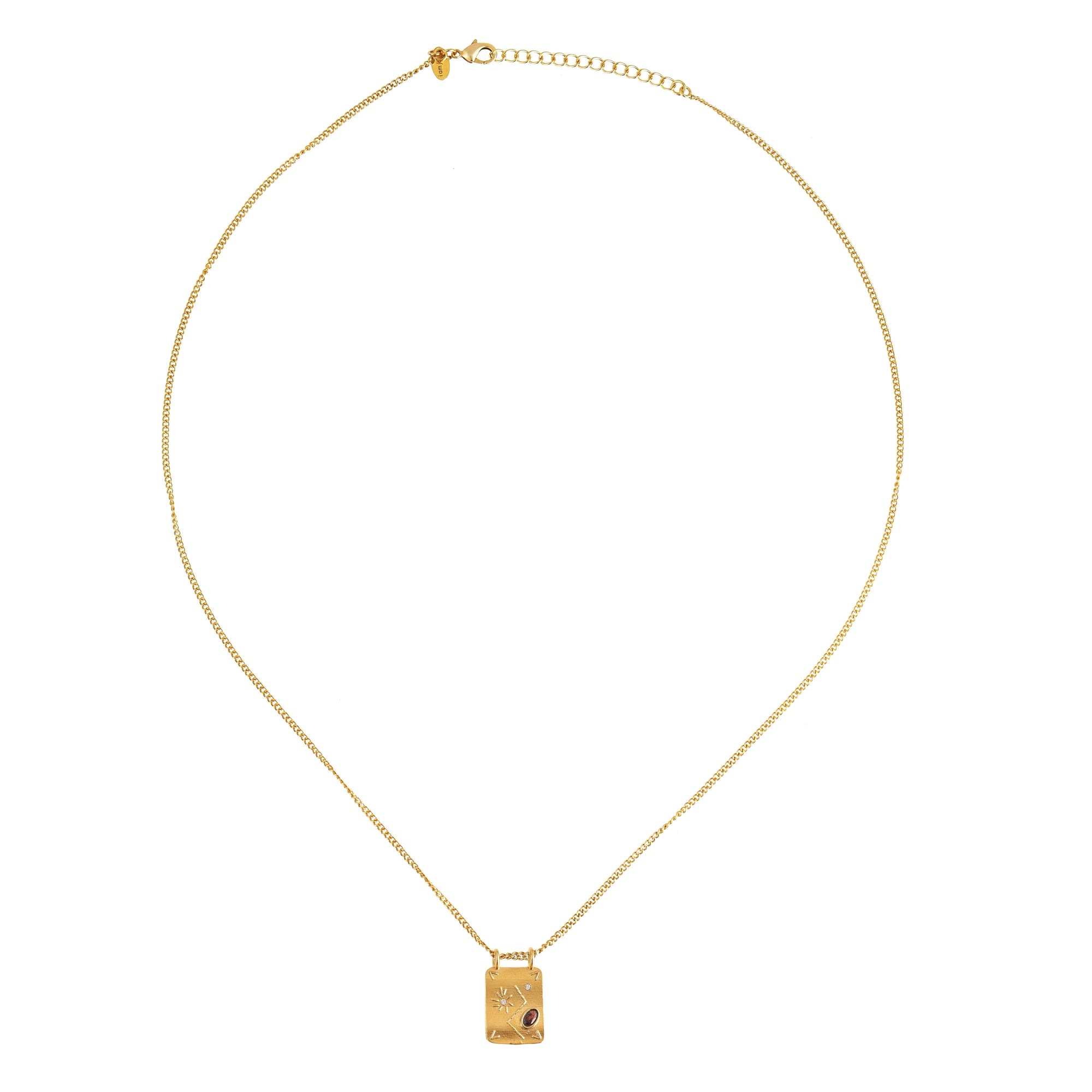De fijne gouden gourmet ketting draagt een vierkante bedel afgewerkt met delicate witte zirkonia steentjes en een klein rood granaat steentje als krachtig accent. De symbolen geven het sieraad een betekenisvolle uitstraling en maken elke look net dat beetje specialer.