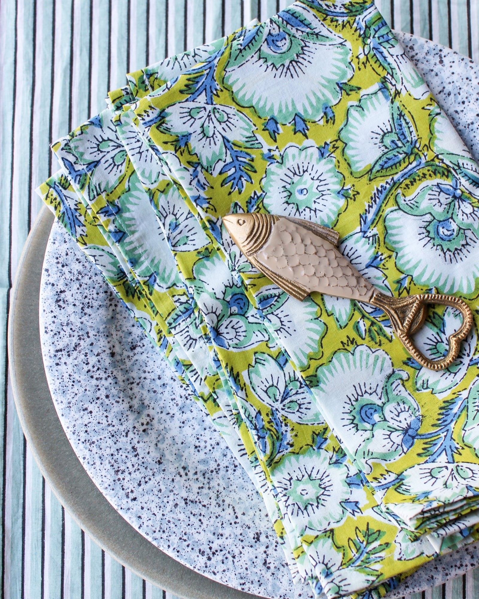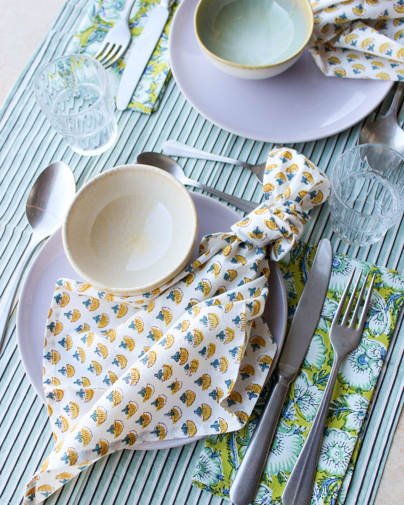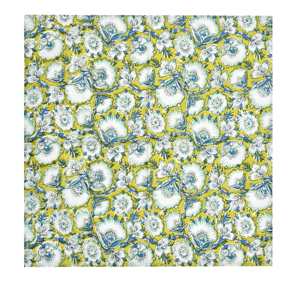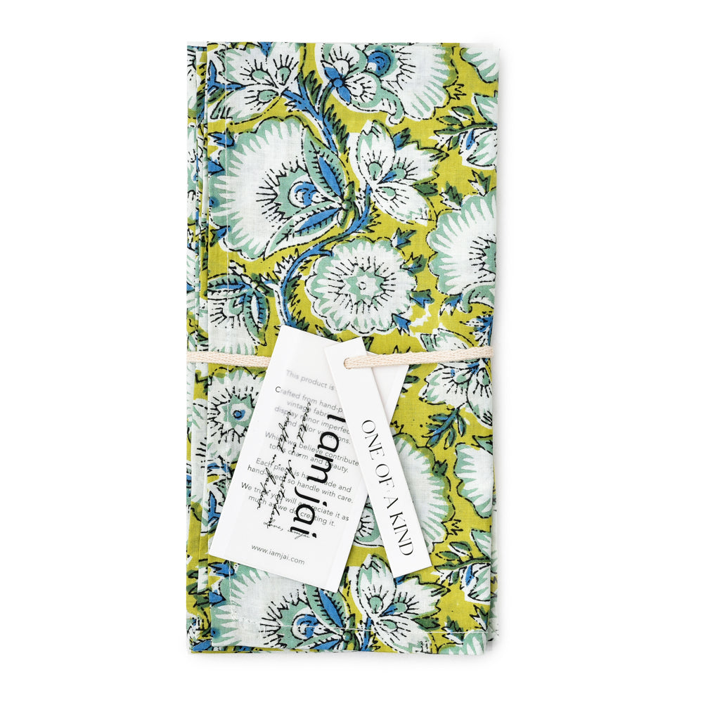 Set van 4 katoenen servetten in groen-geel bloemendesign, handbedrukt met traditionele blockprint. Elk patroon wordt met zorg aangebracht met een handgesneden houten blok, wat zorgt voor een uniek en ambachtelijk karakter. Tijdloos, duurzaam en met oog voor detail, een prachtige toevoeging aan elke eetervaring. Perfect voor jezelf of als cadeau.