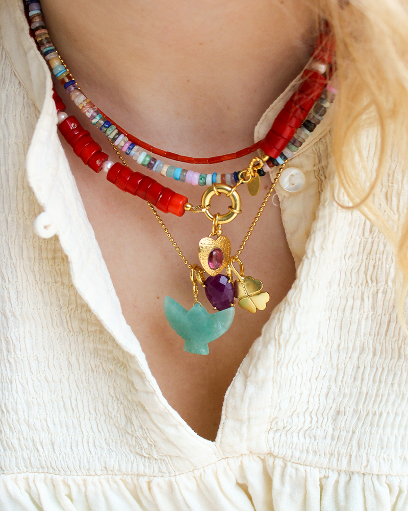 Deze gouden hart bedel met roze steen voelt persoonlijk en zacht, maar heeft tegelijk karakter. Het hart heeft een licht gehamerd oppervlak, waardoor het goud subtiel speelt met het licht. In het midden ligt een roze steen, zorgvuldig gezet en net even anders bij elke bedel. Draag ’m solo aan een ketting voor een rustige look, of mix ’m met andere bedels voor een gelaagd geheel.