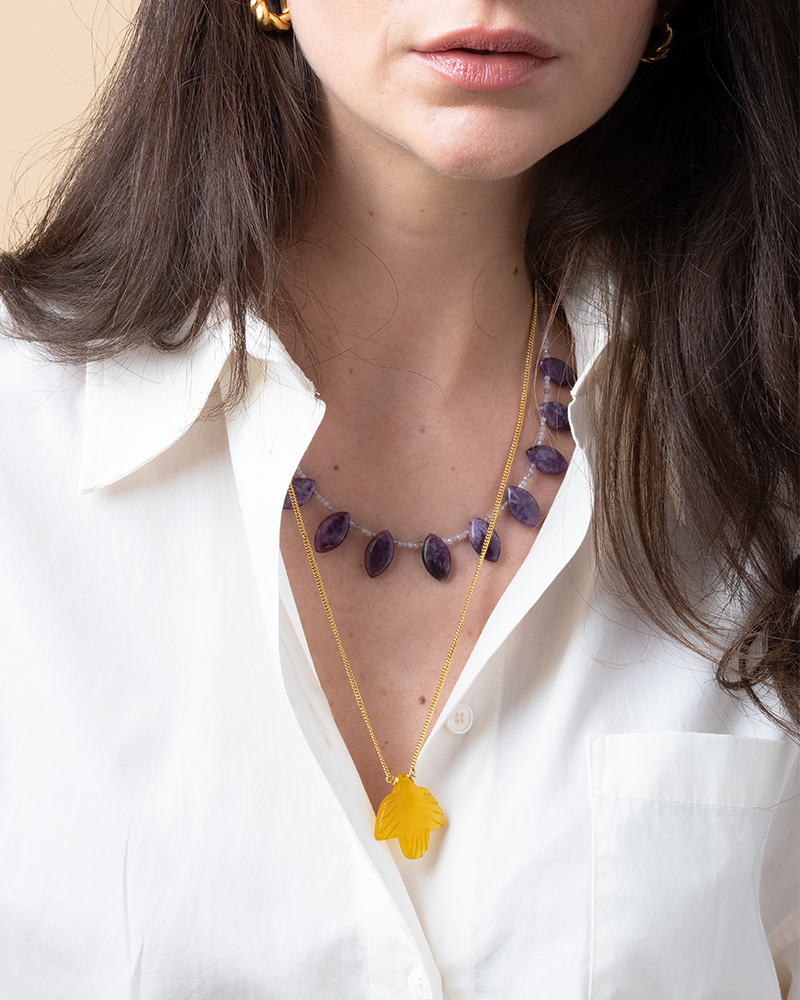 Deze elegante gouden ketting wordt verfraaid door een hand gegraveerde vogel van gele onyx, die een warme, natuurlijke gloed uitstraalt. De verfijnde details van de vogel maken de ketting uniek en bijzonder, terwijl het gouden ontwerp een tijdloze luxe toevoegt. Perfect als statement op zichzelf of als persoonlijk accent in je sieraden collectie.