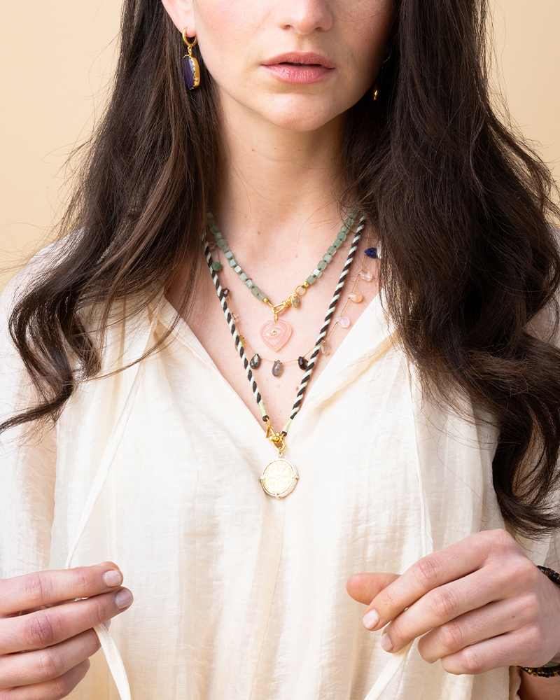 Deze handgeknoopte ketting is gemaakt van kleine blokjes groene jade steen, elk met zijn eigen schakering van blauwgroen. Het 18k vergulde messing slot geeft een luxe touch en maakt het makkelijk om bedels toe te voegen. Draag ‘m solo voor een subtiel kleuraccent of combineer met andere kettingen voor een gelaagde, persoonlijke look.