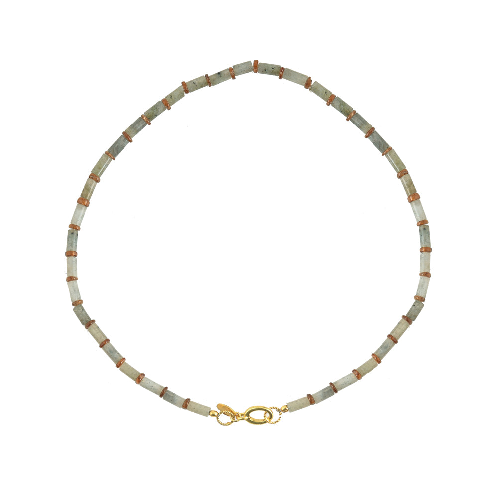 - Labradoriet staafjes edelstenen ketting met bruine agaat tussenstukjes