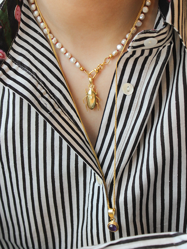 Geef je look een speelse en chique flair met deze handgeknoopte parelketting op rood draad. Handgemaakt en verguld met 18-karaats goud, met een mooi slotje waaraan je bedels kunt hangen. Perfect om solo te dragen of te combineren met andere kettingen voor een gedurfde, trendy uitstraling!